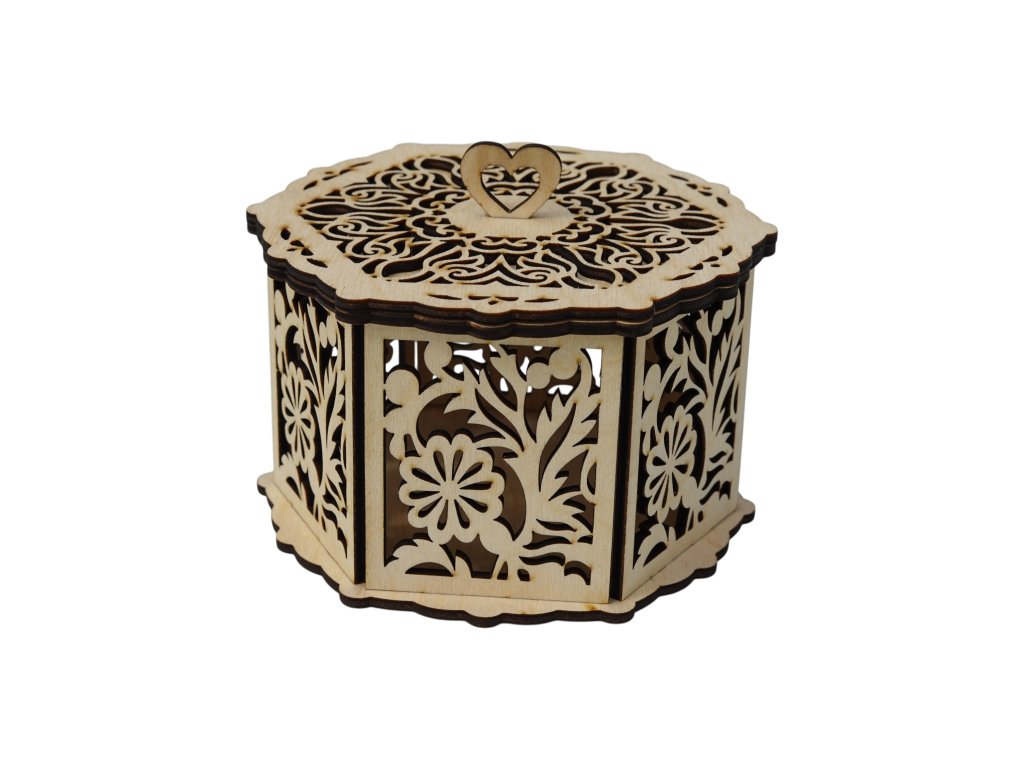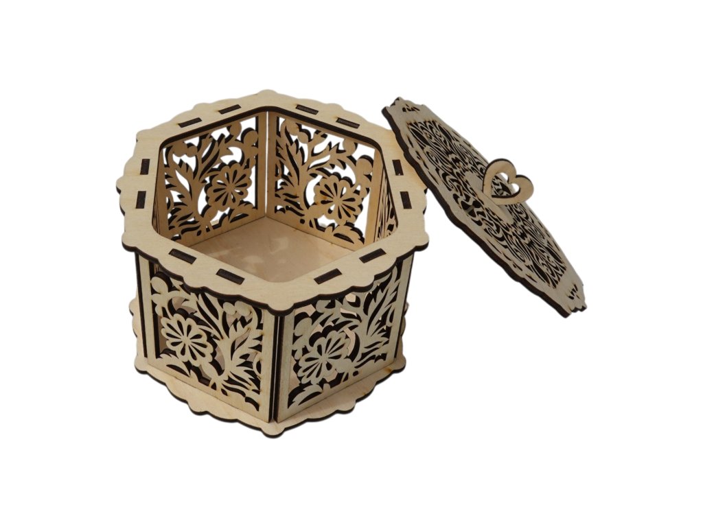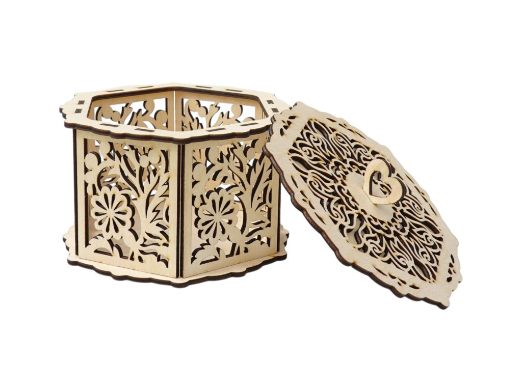 Elegantní dřevěná krabička vhodná na šperky, drobnosti nebo jako stylová dekorace. Vzdušný vzor a jemné zpracování z ní dělají praktický i estetický doplněk.